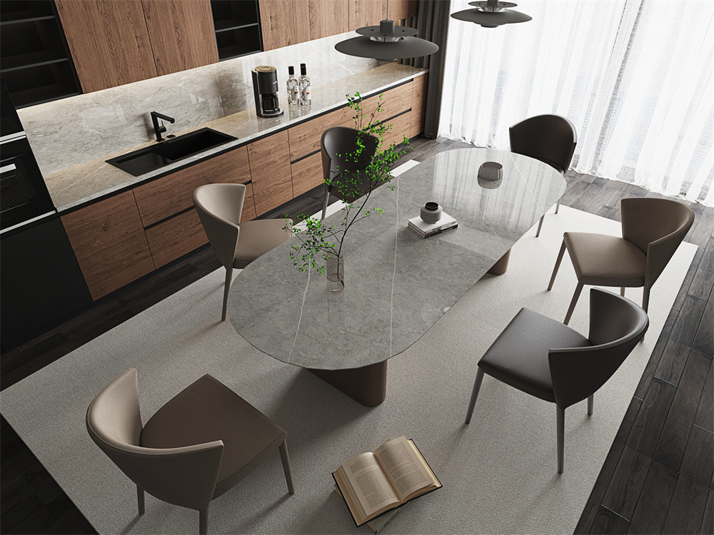 Transforme su oficina con el atractivo elegante de losas de piedra sinterizada de color gris claro pulido como superficie de su escritorio.Estética minimalista.Las losas de piedra sinterizada pulida proporcionan una superficie reflectante que ilumina suavemente la habitación, creando un ambiente acogedor para el trabajo o el estudio.Sus propiedades duraderas y fáciles de limpiar aseguran que su escritorio permanezca intacto y funcional a lo largo del tiempo, promoviendo tanto la eficiencia como el estilo.